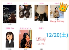 前半に退勤:ひかり、まき 後半に退勤:れいな、あや 閉店まで:店長 〜〜〜〜〜〜〜〜〜〜〜〜〜〜〜〜〜〜〜〜〜〜〜〜〜〜〜 12月はイベント盛り沢山なので 箇条書きでご紹介! 12/1(月)〜30(火)まで ①CKG総選挙投票期間全店舗対象イベント 12/1(月)〜20(土)まで ②クリスマスチケット販売全店舗対象イベント ③CKG予想期間全店舗対象イベント 12/20(土) ④ひいろちゃん誕生日LUSTYのみイベント みんなで🎉クラッカー片手に CountDownしましょ! 12/23(火)〜25(木)まで ⑤クリスマスチケット使用🉑全店舗対象イベント ⑥スタンプラリーLUSTYのみイベント 2個目でチェキフレームプレゼント 3個目でチェキ1枚サービス ⑦サンタコスでお出迎えLUSTYのみイベント 12/28(日)〜30(火) ⑧臨時営業LUSTY&ANKLET対象 〜〜〜〜〜〜〜〜〜〜〜〜〜〜〜〜〜〜〜〜〜〜〜〜〜〜〜 明日以降!!! 19(金) 前半に退勤:ひかり、ひめか、れか 後半に退勤:うめ 閉店まで:店長、ひいろ、みお 20(土)ひいろBirthday💕C.D. 前半に退勤:ひかり、ひめか 後半に退勤:みお 閉店まで:うみ、店長、ひいろ 21(日) 定休日 急遽変更になる場合もあります。 ご了承下さい。